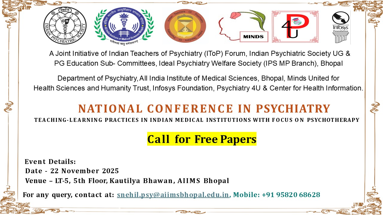 Indian Teachers of Psychiatry Forum is a platform for all teachers of psychiatry in India to share experiences and resources that benefits psychiatry training of undergraduate and postgraduates, which in turn contributes to the service of public at large.